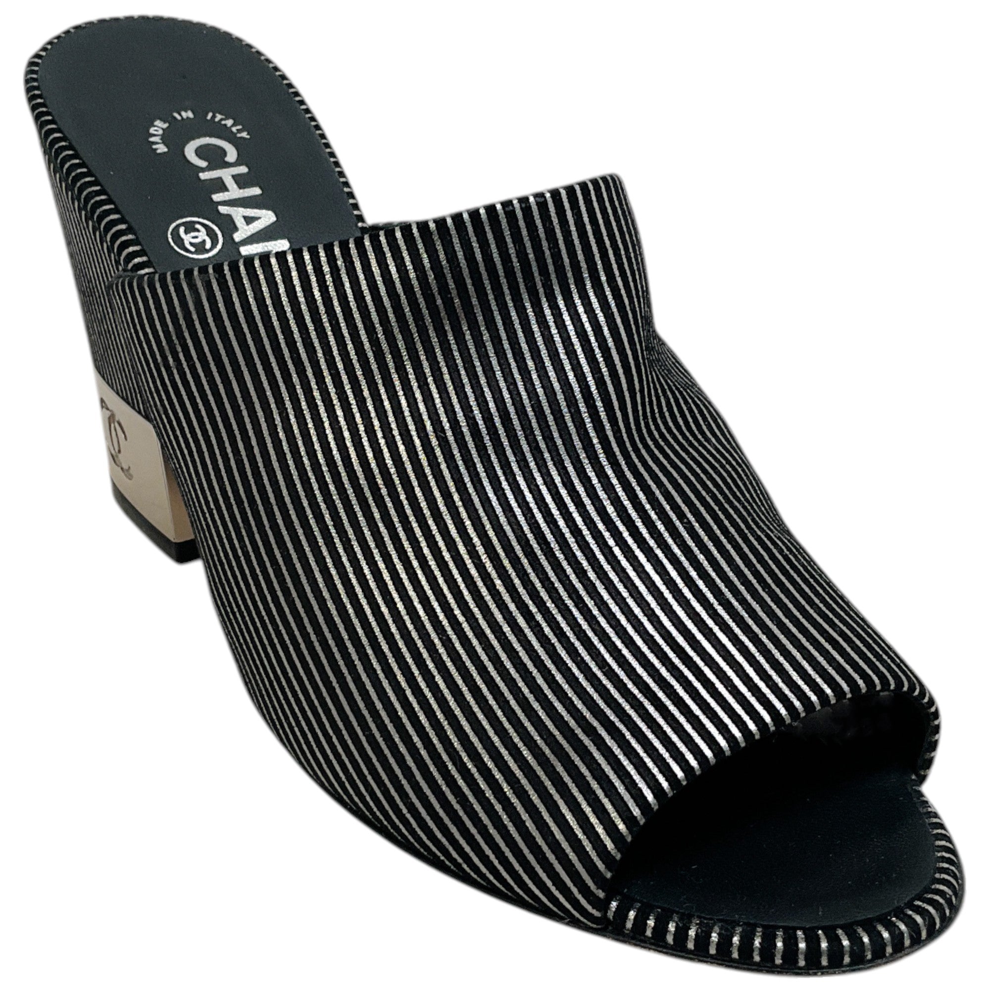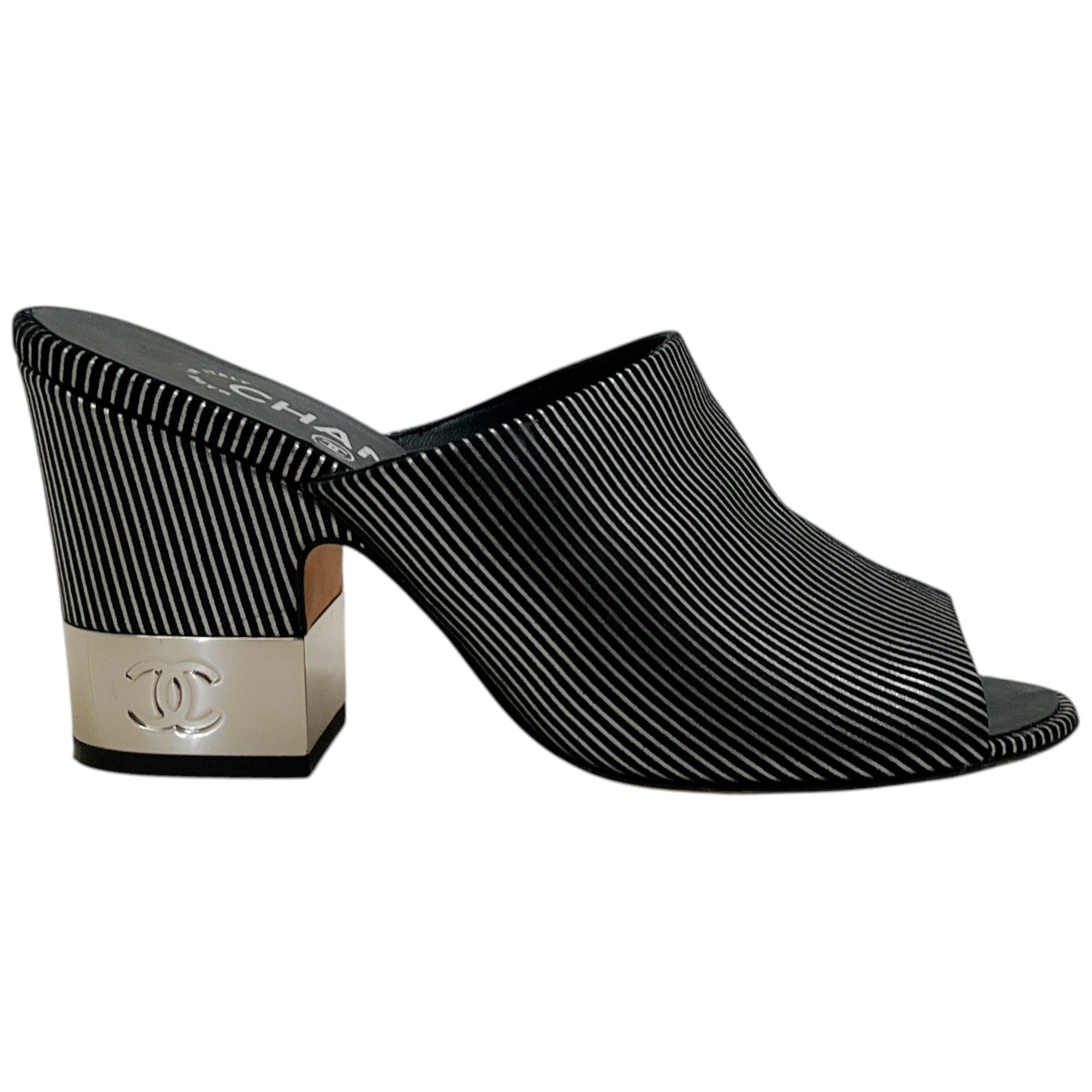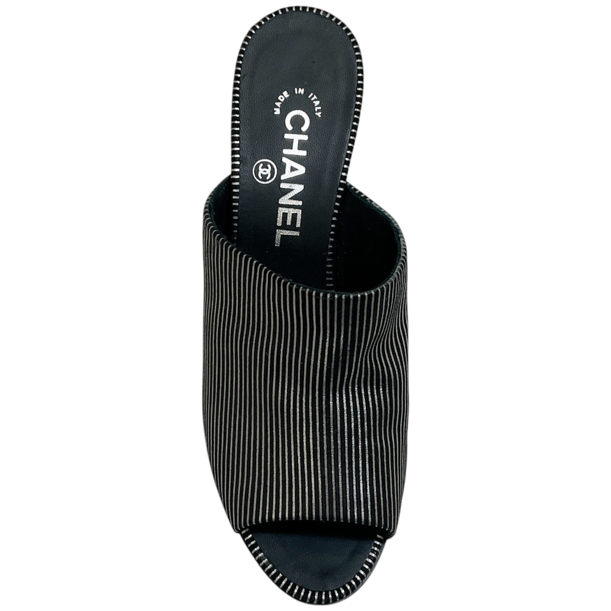 Chanel Black Suede Mules with Silver Stripes