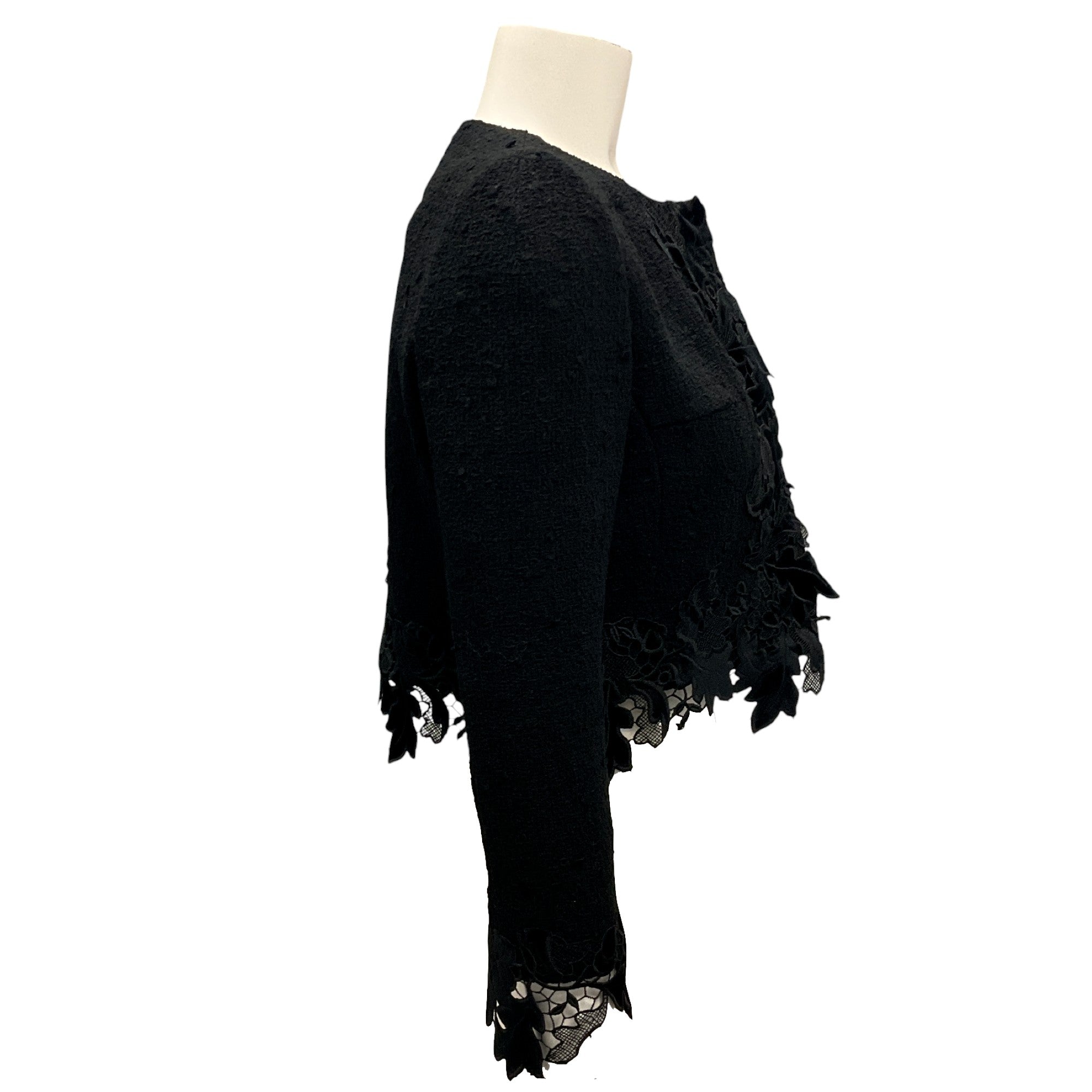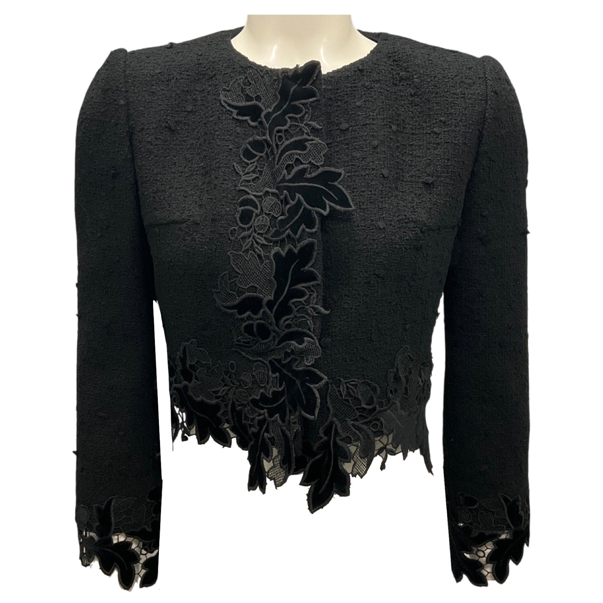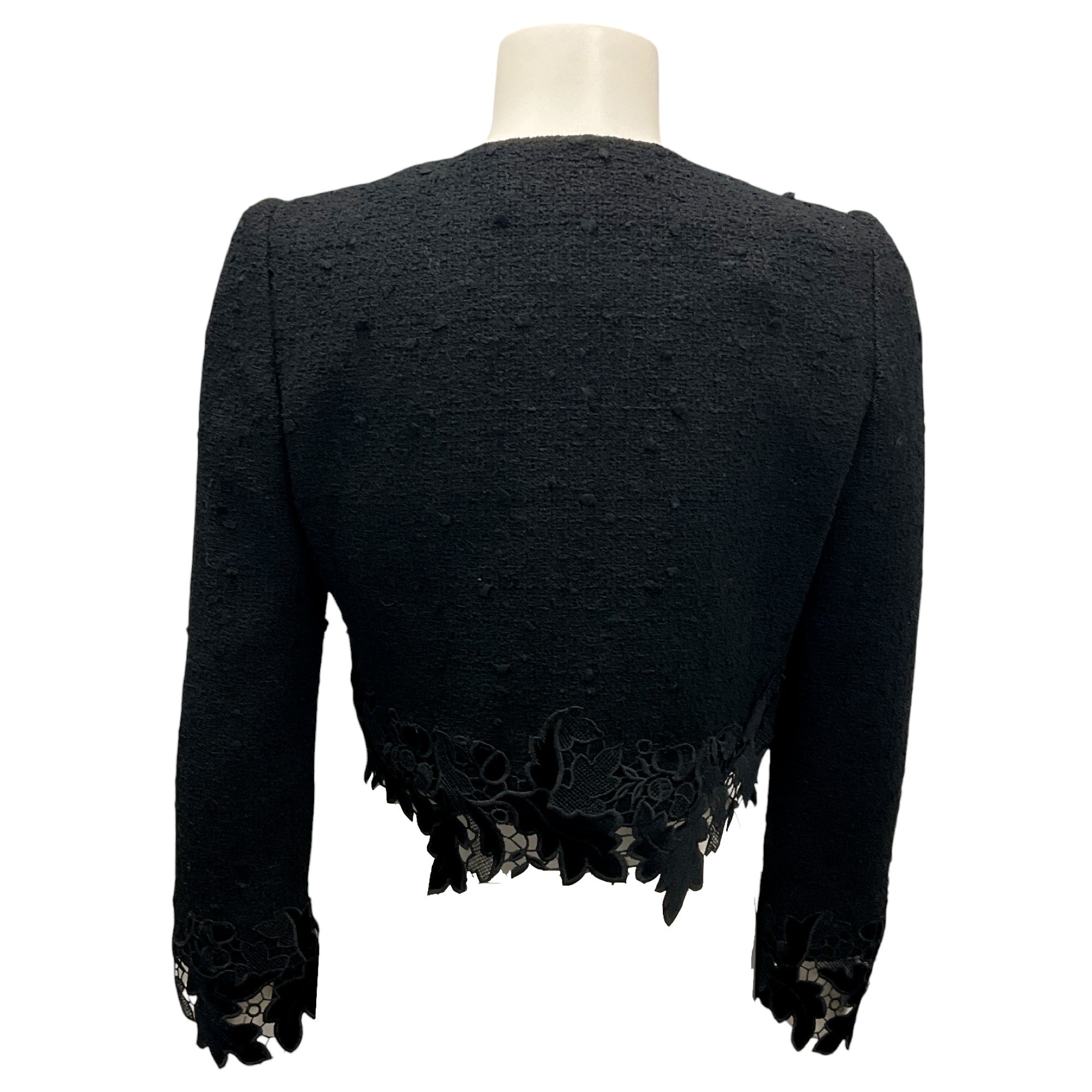 Oscar de la Renta Black Fall 2023 Embroidered Lace Trimmed Cropped Tweed Jacket